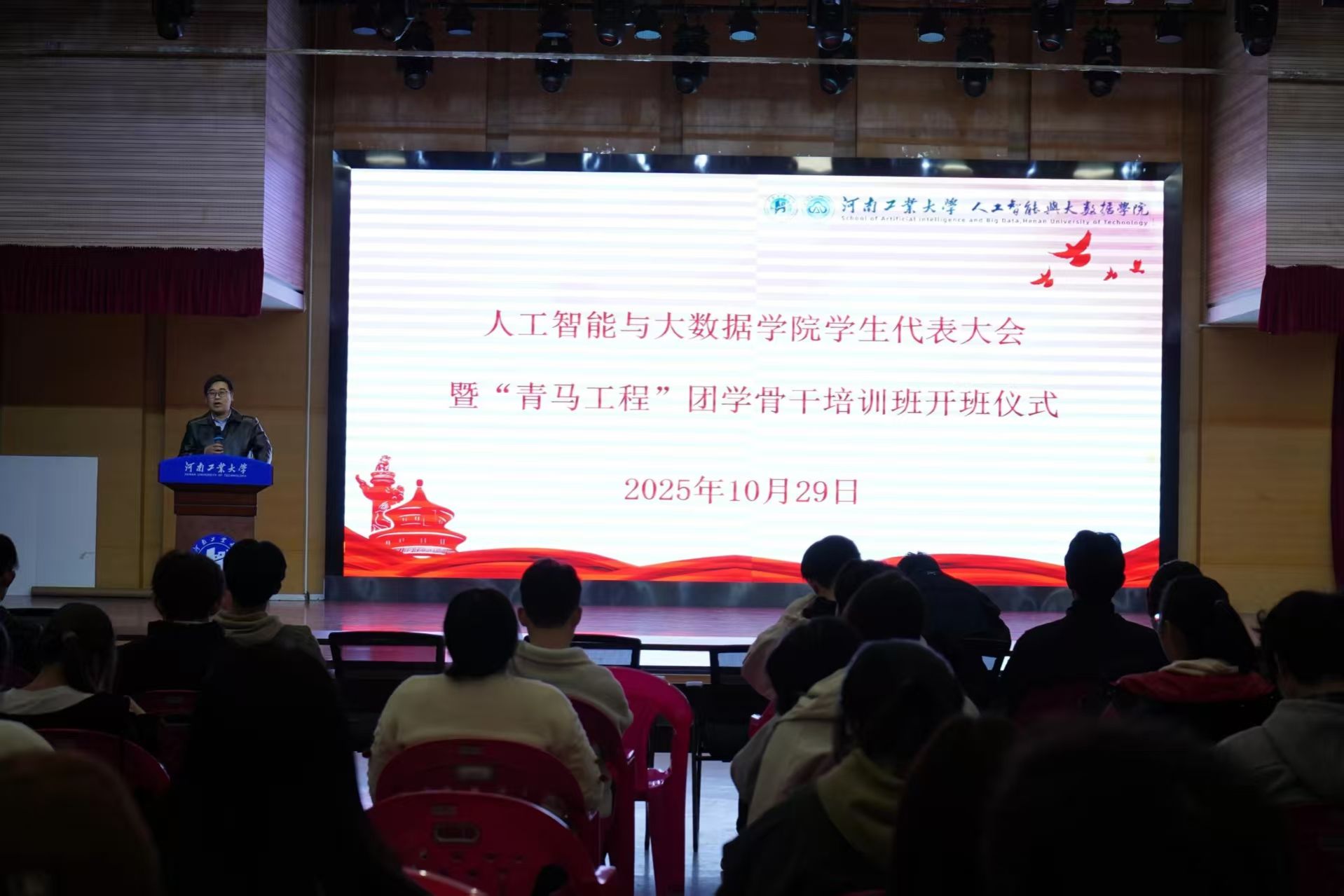 学生代表大会结束后,党委副书记赵志洋以《做新时代坚定的青年马克思主义者》为题展开了“青马工程”团学骨干培训班第一讲。他强调新时代青年要筑牢信仰之基、深化理论武装、坚持知行合一。结合人工智能技术迅猛发展的时代背景,他鼓励学生要将专业学习与社会实践深度融合,在服务社会与同学中增长才干,在民族复兴赛道上奋勇争先。