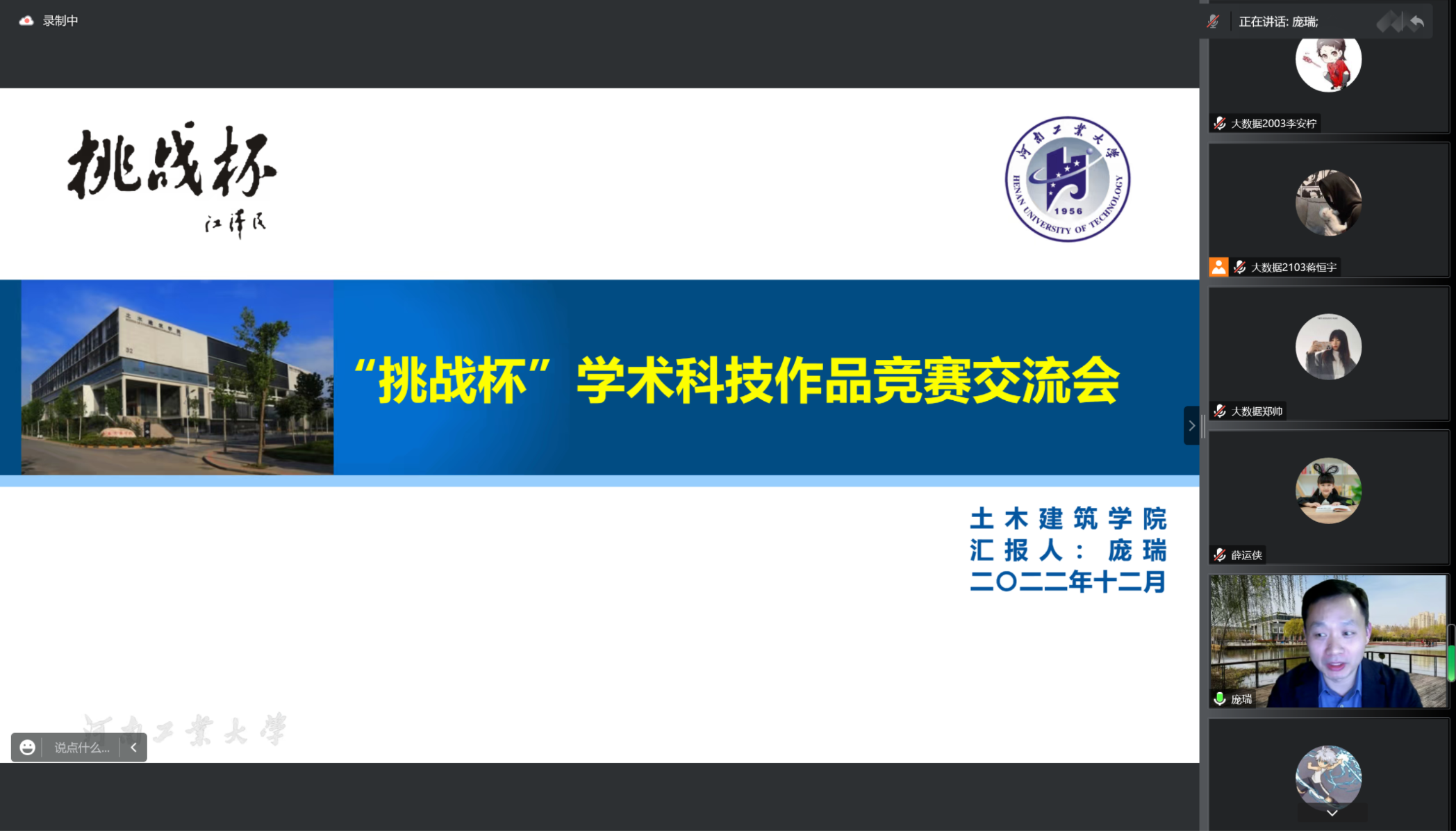 庞瑞老师从挑战杯的意义谈起,详细向同学们介绍了大赛的宗旨、目的、影响力、方式、类型,指出该赛事是青年成长成才的重要平台,并特别强调项目作品的学术价值和创新性,认为成人片
