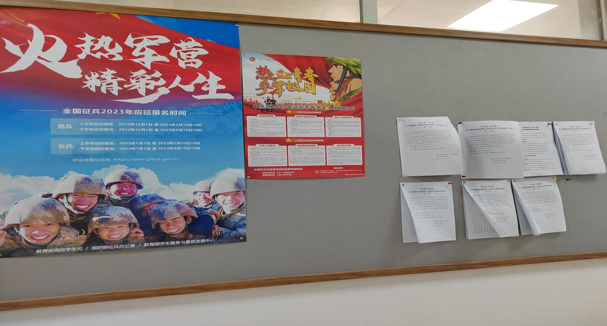 精心设计宣传资料,普及相关政策。近日,学院在六号楼附近重要区域张贴了征兵宣传海报,展示了征兵时间安排、基本流程和一年两次征兵的保障政策;宣传展板,通过一幅幅图片和一段段文字,突显中国人民解放军发展历程,让青年学子更加懂得新时代幸福生活的来之不易,自觉凝聚起报国强军的强大力量。学院的征兵宣传海报和展板展示,既增强同学们的国防意识,了解军事技能和知识,又让同学们感受到人民军队现代化建设成就,体会到提升军事素质、加强国防建设的重要性和必要性,强化了保家卫国的爱国情怀。