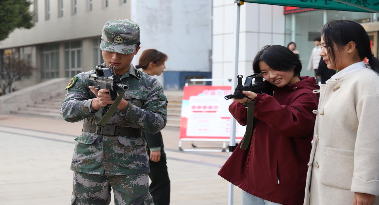 开展军事装备展示活动,“沉浸式”体验国防教育。11月28日下午,学院在六号楼正门处设立征兵咨询点,开展军事装备展示活动。发放有关国防动员的宣传手册,普及国防相关知识,为同学们解答国防专业知识和征兵宣传政策。学院重点开展了军事装备展示活动,在退役学生的指导下,各类武器装备如步枪、轻机枪、迫击炮等,吸引了大批学生前来观看,大家跃跃欲试,亲自上前感受体验,单兵自热食品的演示也令同学们赞叹连连,在这里,大家“零距离沉浸式”体验军旅生活日常,点燃了莘莘学子心中的戎装梦想。学院针对此次征兵宣传开展军事装备展示活动、身临其境“沉浸式”体验国防教育,激发起大学生应征入伍、保家卫国的热情,在学院学生中产生了良好反响。