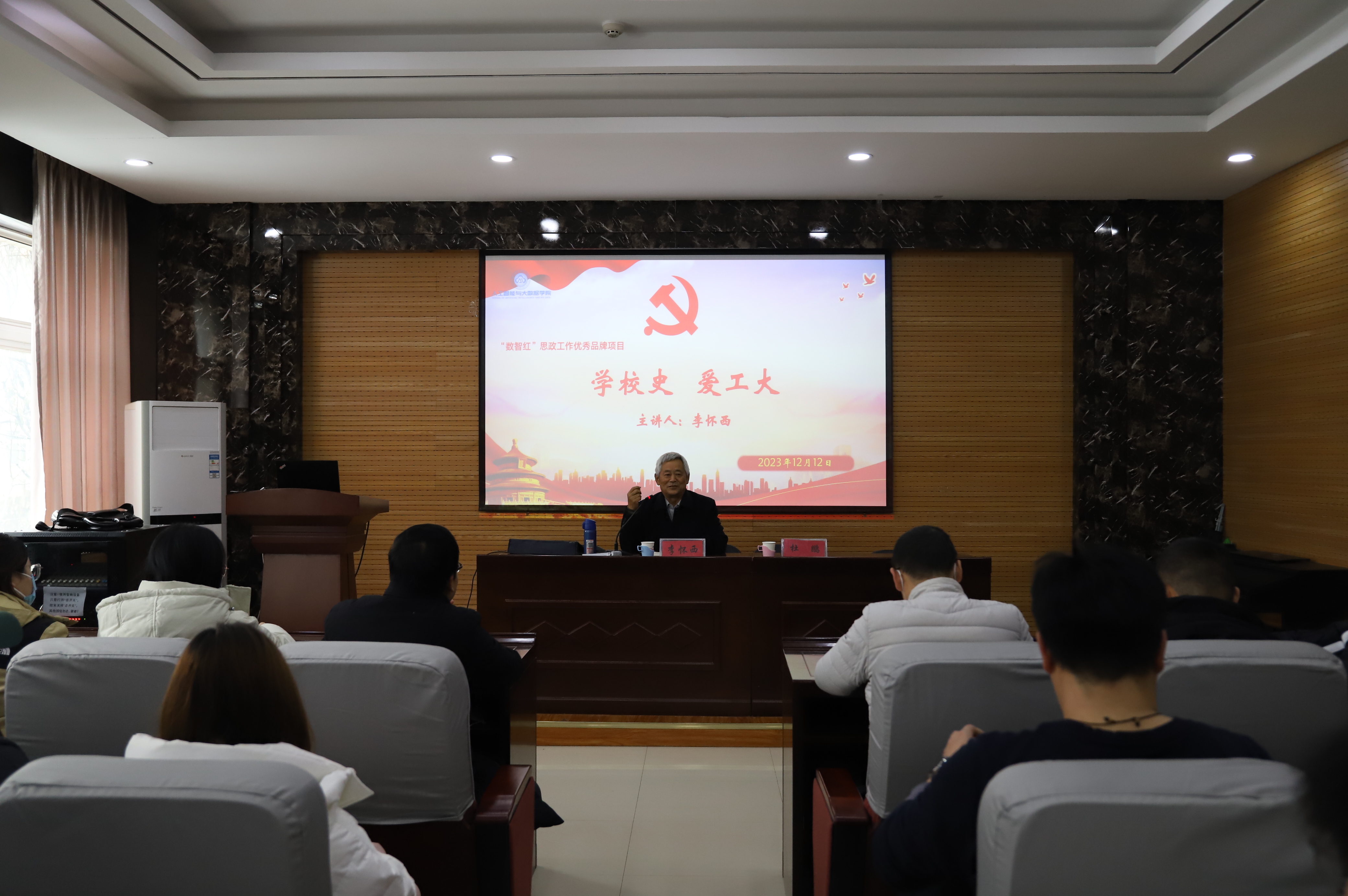 退休干部、管理学院党委原书记李怀西主讲,教师代表及学生参加此次讲座,讲座由学院党委书记杜鹏主持。