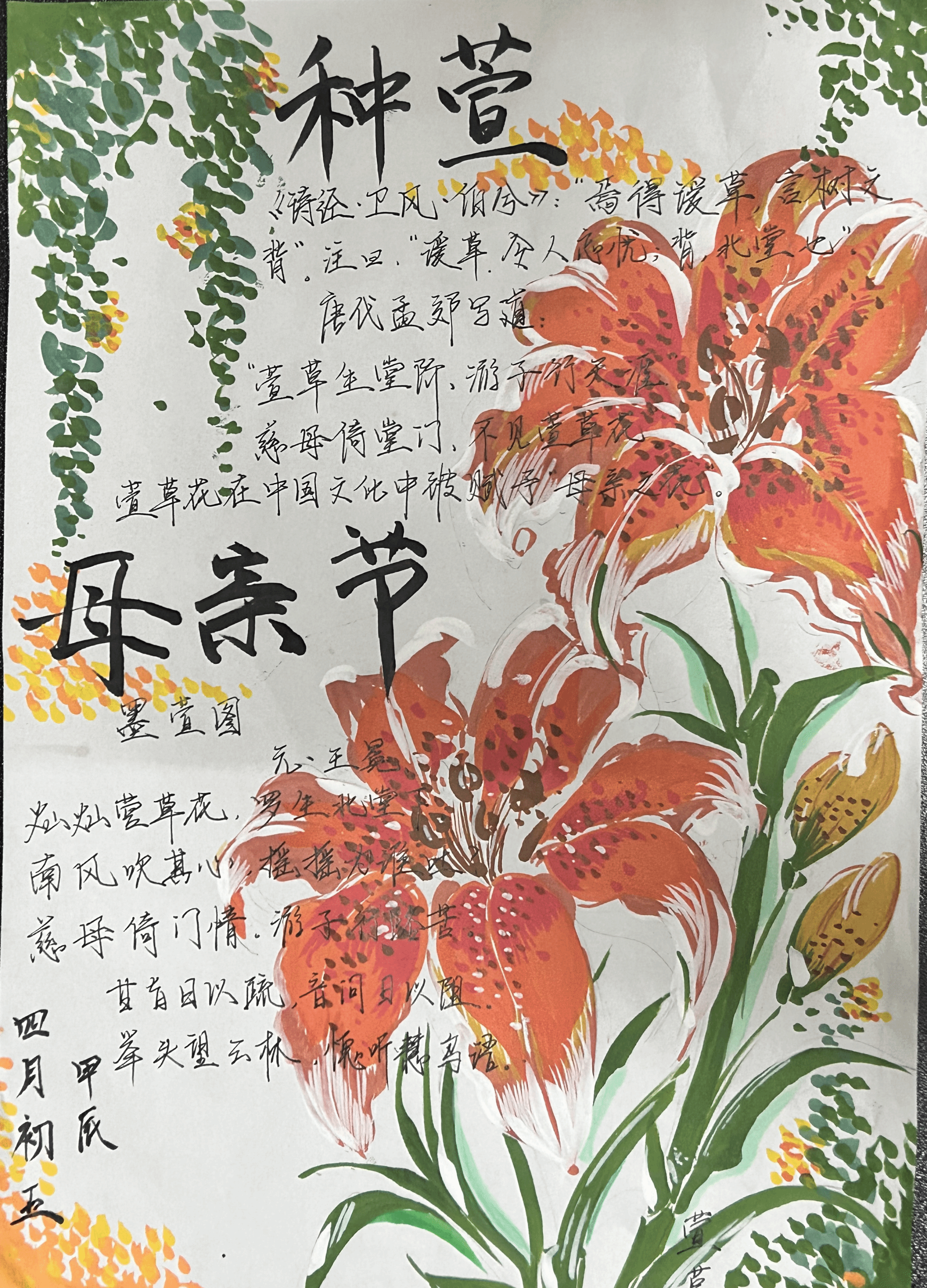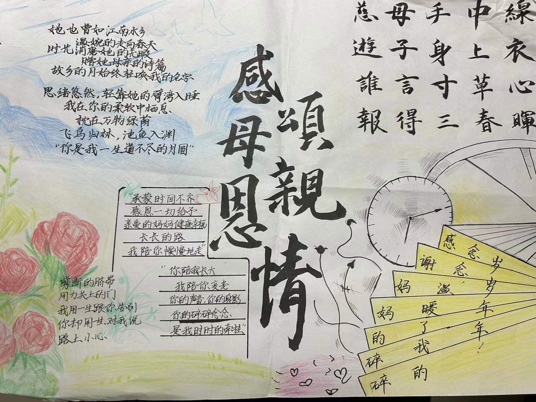 开展了“感恩母爱”主题手抄报活动。 同学们认真搜集素材,精心设计排版,将自己对母亲的爱融入到一张张精心创作的手抄报中。手抄报作品或内容详实,或文笔优美,或图案精致,同学们用他们朴实的行动和感恩的心,表达着对妈妈的爱。