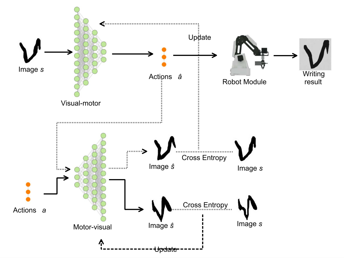 该成果针对机器人学习书法技能的复杂性提出了一种创新的解决方案。吴瑞琪博士在解决方案中提出一种基于机器人手眼协调方法的书法机器人控制框架,以解决现有方法存在的计算成本高和生成结果多样性有限等限制。受内模控制(IMC)系统的启发,该方案构建了一个视觉--运动网络和一个运动--视觉网络,分别模拟机器人手眼协调的直接模型和逆向模型。主要框架如图1所示,视觉--运动网络作为动作生成器,将图像输入转化为机器人动作,而运动--视觉网络则辅助视觉-运动网络的训练。通过机械臂的随机书写,建立了运动-视觉网络的预训练。实验结果表明,该方法能够成功地通过输入目标笔画图像来书写汉字的笔画。尽管该方法是应用于机器人书法,但其底层研究也可适用于许多其他应用,例如机器人的运动模仿。