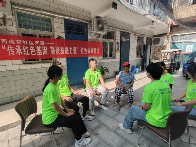 烈日炎炎,实践团怀着激动的心情来到了安阳西南营社区服务中心,与社区人员一起开展了“传承红色基因,凝聚奋进力量”红色故事宣讲活动。在社区人员的帮助下,邀请到了一名90岁高龄的老党员高奶奶,高奶奶的爱人曾是彭德怀部队的一名军人,她用自己的亲身经历为同学们讲述了一堂精彩的红色故事。她讲述了中国共产党自成立一百周年来所遇到的的艰难险阻,以及在当时如此艰难的情况下,共产党人如何破冰、如何奋力救党、救国、救民的故事。说起这些革命岁月,高奶奶慷慨激昂,在讲述的过程中她拿出了与爱人的合影,照片中的爷爷胸前挂着一排排勋章,那是作为红色精神的极高表现,奶奶脸上洋溢着淡淡笑容,那是对党的历史的肯定、对社会发展的肯定和对自己身为党员的自豪。她说:“现在我们国家在世界面前是有底气的,原因就是在我们党的领导下,我们的国家越发地强大,我为自己身为一个中国人而无比自豪!作为一个共产党员,不论身在何处,都要时时刻刻心系祖国。”