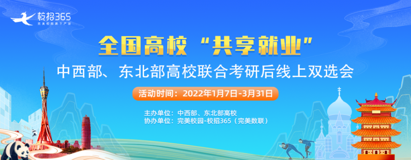 当前,疫情防控仍然处于关键时期,考研分数国家线预计将于3月底公布,为最大程度降低疫情对毕业生就业的影响,进一步满足考研分数国家线公布后的毕业生求职应聘和用人单位人才选聘需求,经中西部、东北部地区高校与完美数联共同商议,决定举办全国高校“共享就业”中西部、东北部高校联合考研后线上双选会,本次活动以“职位共享、资源共享、渠道共享”为主旨,助力高校毕业生更高质量、更充分就业,具体安排如下: